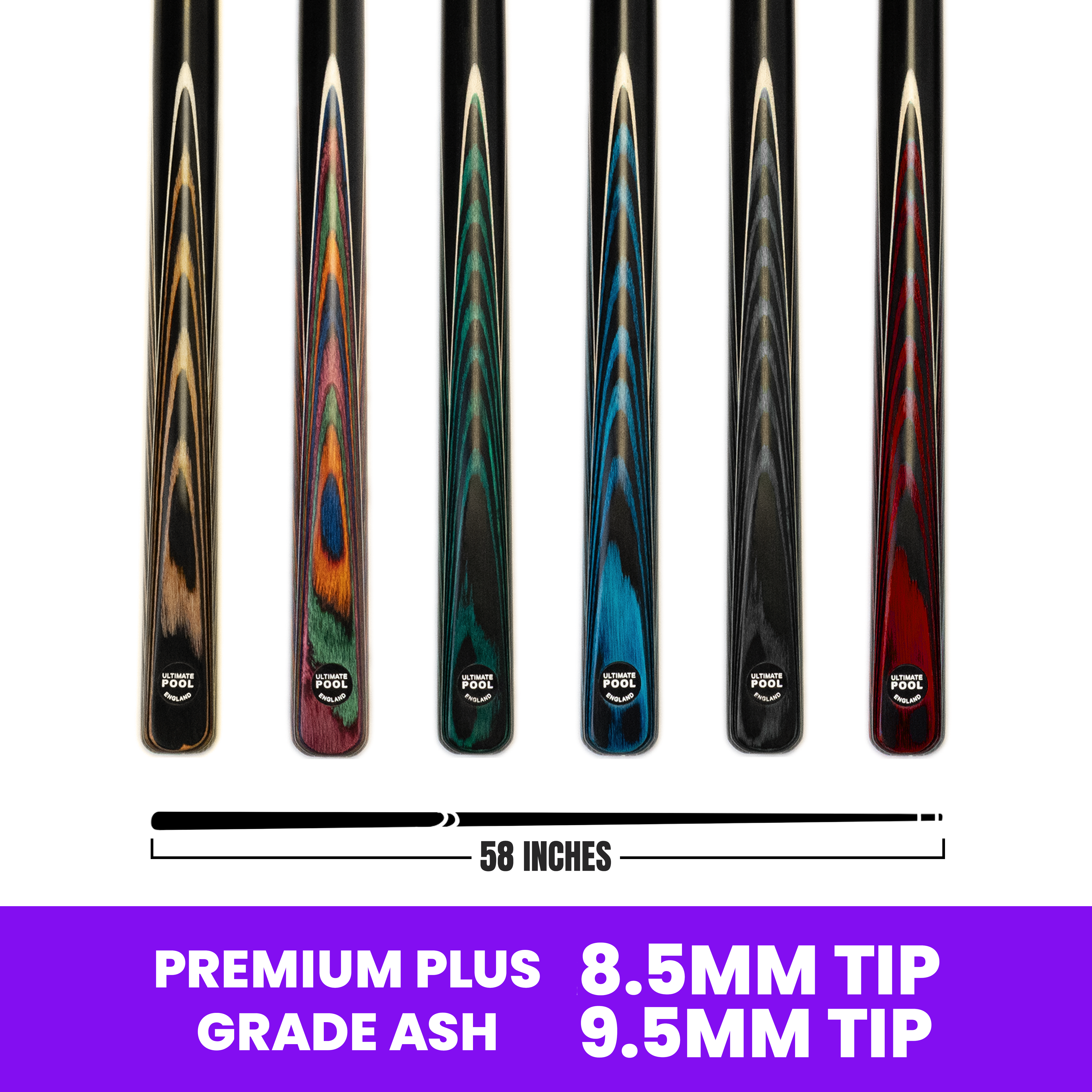 A luxurious selection of six superior graded ebony and ash cues ranging from the classic emerald green butt ¾ cue to the contemporary options of the multicoloured splice work completing a truly outstanding and vibrant range.