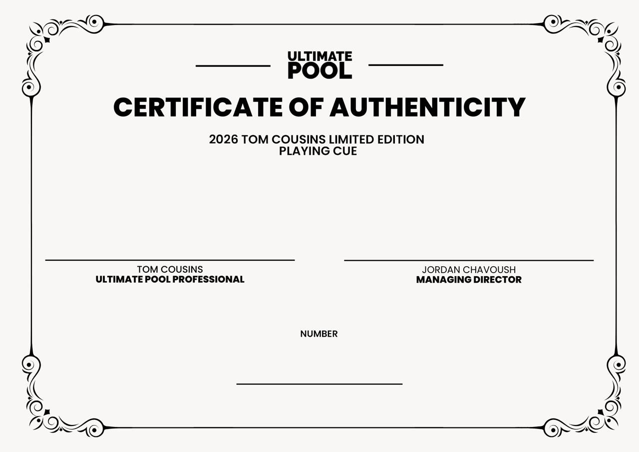 Each cue is hand-finished in the UK and supplied with an individually numbered Certificate of Authenticity, signed by Ultimate Pool professional Tom Cousins and Ultimate Pool Managing Director Jordan Chavoush.